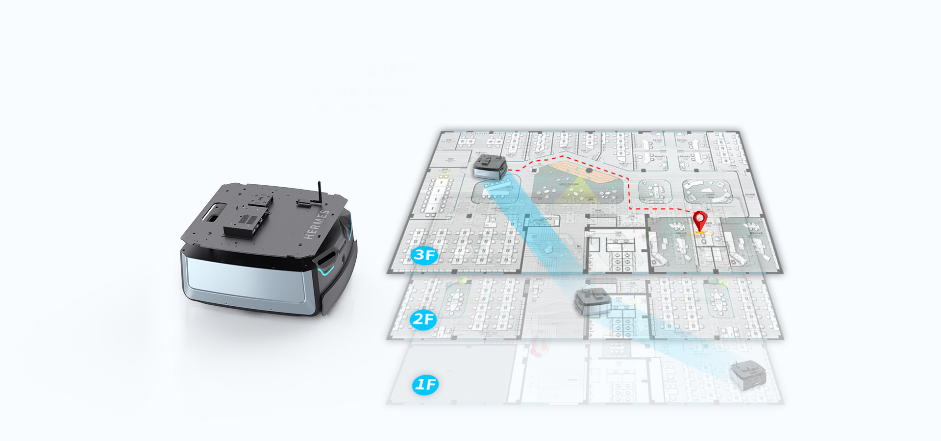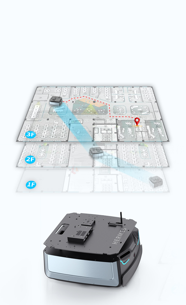 赫尔墨斯搭载了思岚自主研发的多楼层移动方案,自动切换多楼层地图,针对酒店、餐饮、楼宇、政务中心等商用场景,拥有多楼层导航避障能力,实现智能配送。